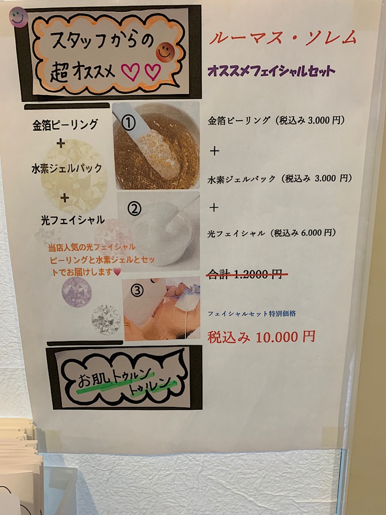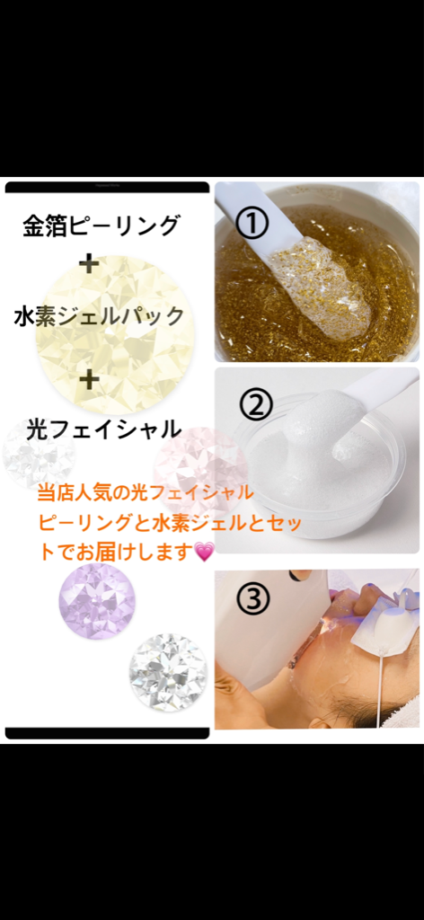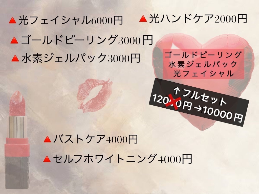 光フェイシャル、光ハンド、水素ジェルパック、ゴールドピーリング、バストケアやセルフホワイトニング、と豊富に取り揃えています🌟