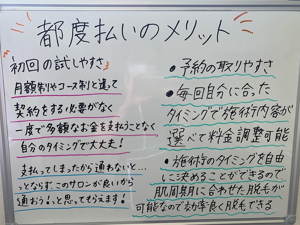 当サロンはその都度払いですので、月額契約や回数券もなく安心して通いやすいのが特徴です。